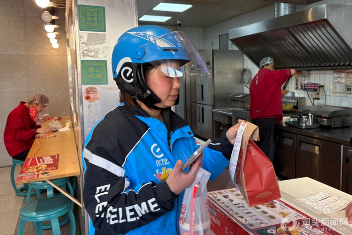 上午十點,在中心街一家快餐店里,店員們雙手不停忙碌,腳步匆匆,在柜臺與后廚之間來回穿梭。此時,外賣騎手許韋韋接到了她今天的第一個訂單,這代表著她一天中最忙碌的時段正式開啟。取完餐品,她迅速騎上電瓶車,馬不停蹄地趕往送餐地點。